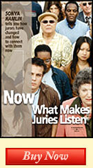 “ Now What Makes Juries Listen documents Sonya Hamlin’s lifetime of experience as the ultimate jury communication expert-- consulting on hundreds of cases, interviewing thousands of jurors and working as a CLE trainer and speaker. Laced with practical advice and illustrated with clear demonstratives, Ms. Hamlin’s book provides unique insights into how today’s multigenerational, diverse, and technology - driven jurors receive and assess information. The many examples of effective communication techniques, from jury selection through final argument, bring a new perspective and approach for even the most experienced trial lawyer. This rare compendium of practical advice and great new ideas for relating to today’s fact finders is a must for every trial lawyer’s library.” – Terry Tottenham, partner in charge, Fulbright and Jaworski,